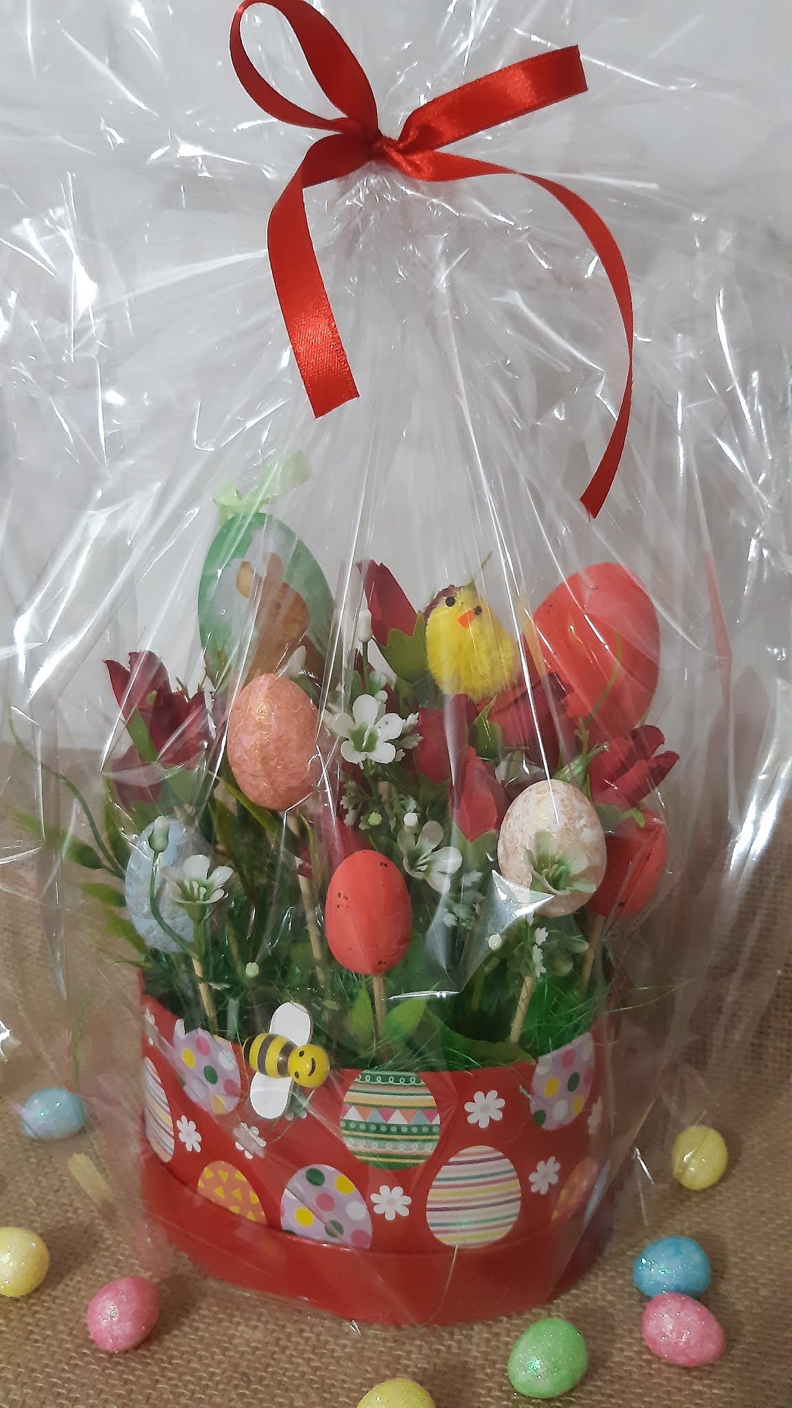 Aranjament pentru masa de Pasti, realizat din cutie in forma de ou, cu motiv de Pasti, decorata cu flori, oua colorate de diverse marimi, albinute, puisori, etc; dimensiuni aranjament fara ambalaj din celofan 13/12/20 cm, pret 30 lei